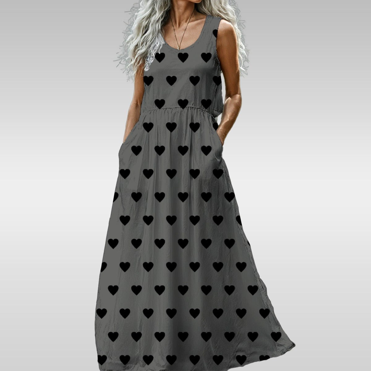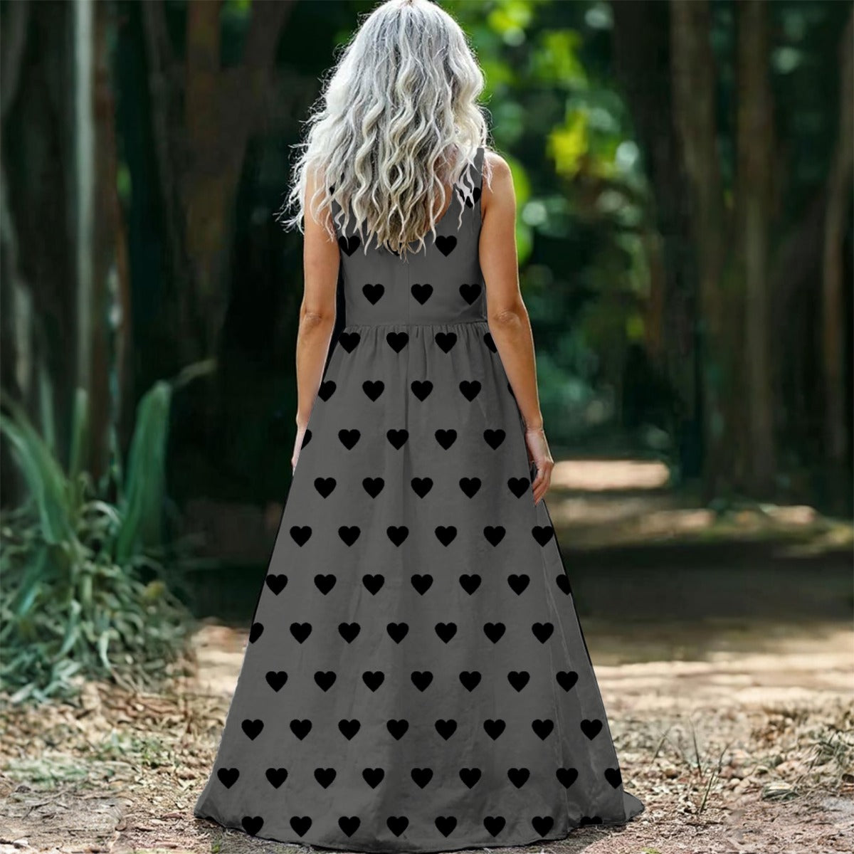 This sleeveless maxi dress designed by Crummy Dumpster is made from lightweight polyester fabric, offering a smooth, breathable feel that's ideal for all seasons. The design features a fitted bodice with a high waistline and a gently flared hem, creating a flattering silhouette with graceful flow. The black heart print adds a vibrant, refreshing touch, making this dress perfect for casual outings, vacations, beach walks, garden parties or just slaying about.