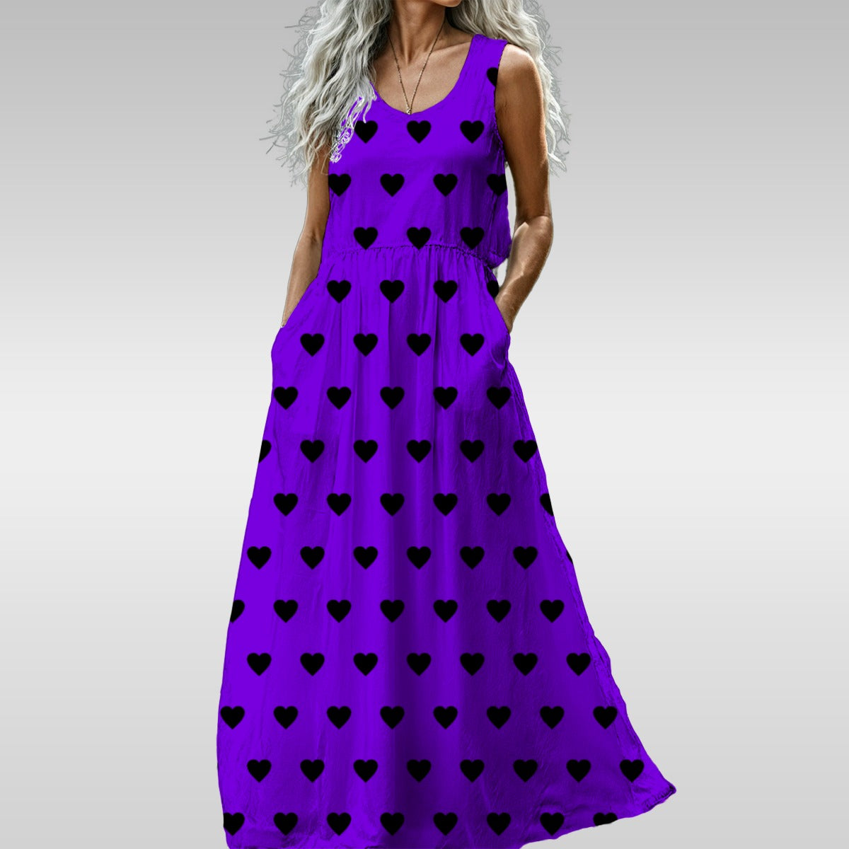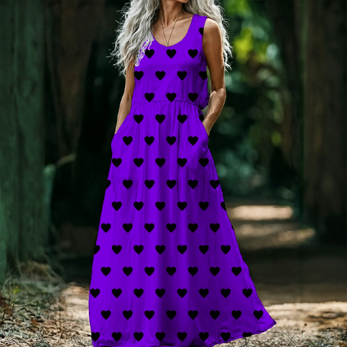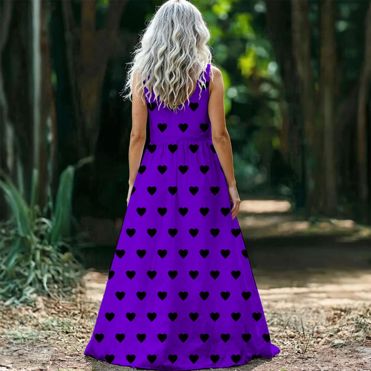 This sleeveless maxi dress designed by Crummy Dumpster is made from lightweight polyester fabric, offering a smooth, breathable feel that's ideal for all seasons. The design features a fitted bodice with a high waistline and a gently flared hem, creating a flattering silhouette with graceful flow. The black heart print adds a vibrant, refreshing touch, making this dress perfect for casual outings, vacations, beach walks, garden parties or just slaying about.
