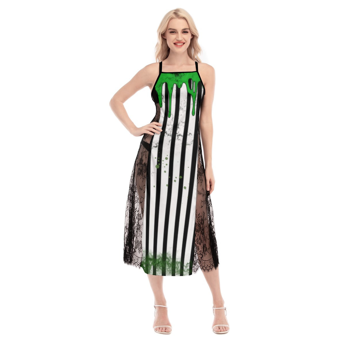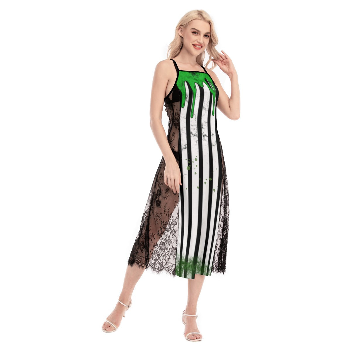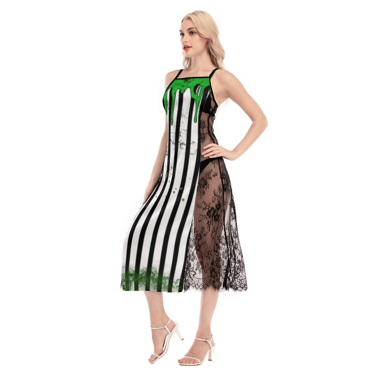 Spooky night dress designed by Crummy Dumpster Sexy black lace mesh on the side, looming figure, thin suspenders can show your ghostly shoulders, neck and back