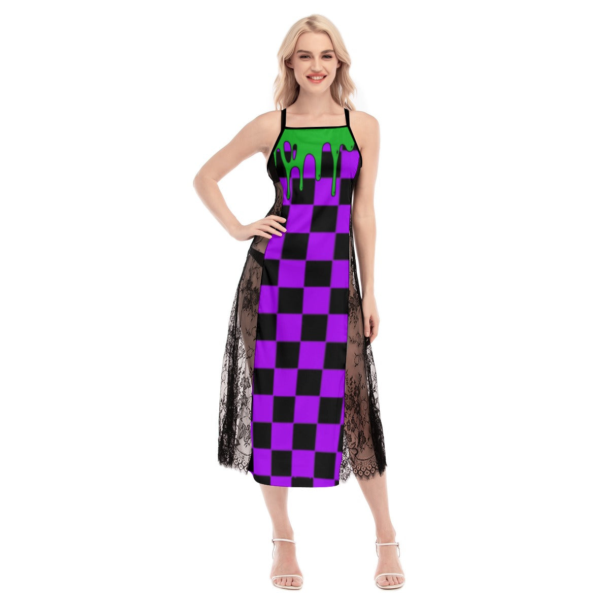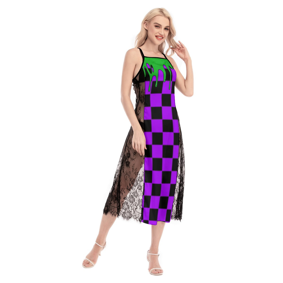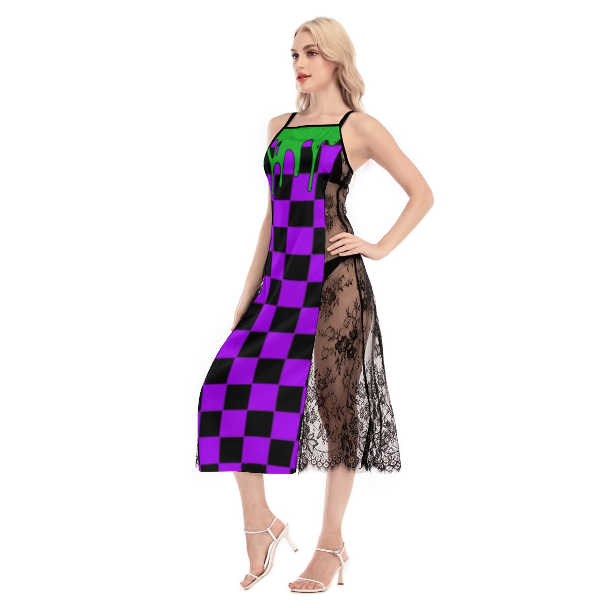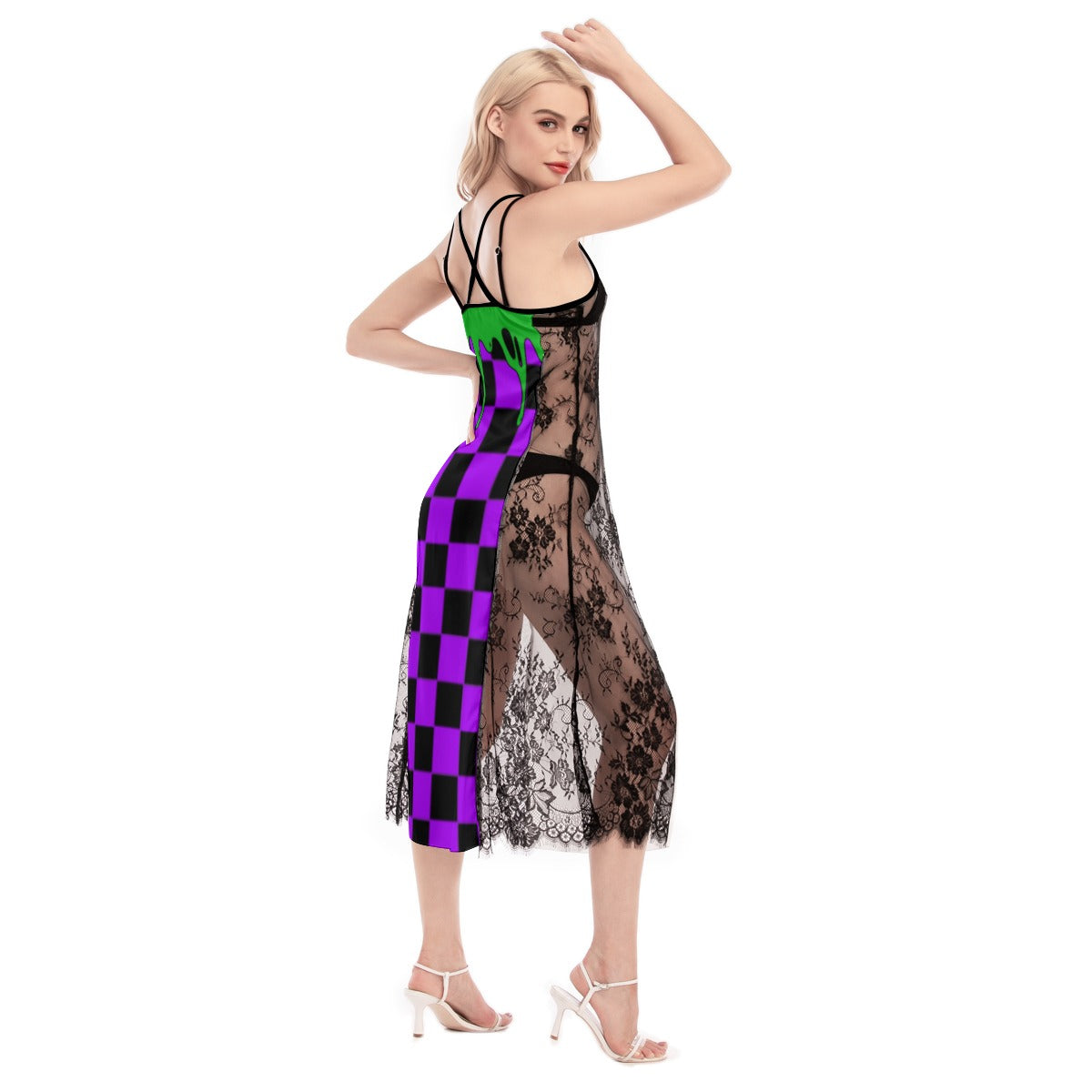 Spooky night dress designed by Crummy Dumpster Sexy black lace mesh on the side, looming figure, thin suspenders can show your shoulders, neck and back